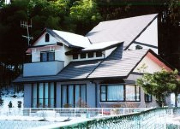 夫婦・子供の3人家族であり、寝室を2階とすることで1階を全て共用スペースとし、居間は上部を吹抜けに、和室とは段差を持たせた一体空間とした。眺望の良い高台の立地であり、緑も多いので自然にマッチする大屋根とした。