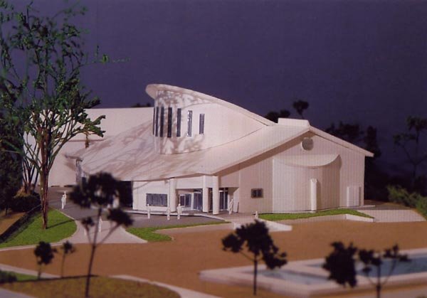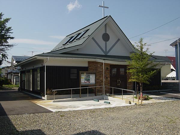 会津坂下町(人口18,000人弱)のほぼ中心に位置するキリスト教会の道路拡幅による改築計画である。敷地、予算等限られた条件の中、多様な利用形態に最大限対応できるよう仕切壁を全て建具とし、人数によりフレキシブルに対応できるよう計画した。外観は左右シンメトリで単純な切り妻端折屋根とし、黒色縦板張りと石貼り、又、ステンドグラス額の板張り風ドア、そして中央にモミのシンボルツリー等により、印象強い教会を表現した。 |