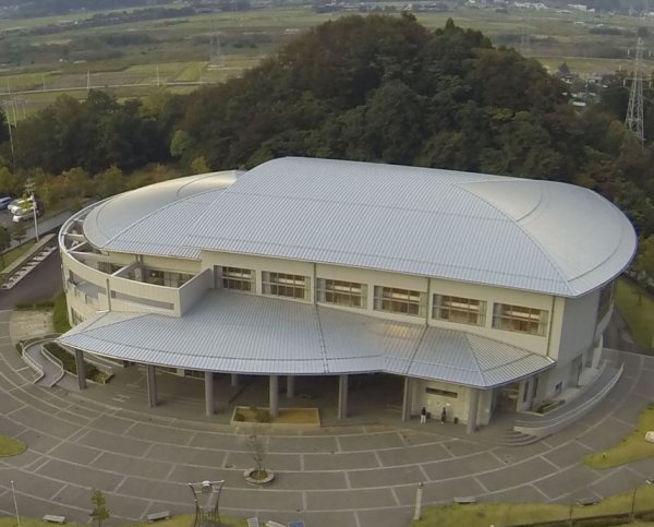 施設、森の中に”生息する施設”をテーマに、昆虫(かぶと虫)をイメージして、森と共存する施設とした。カブト虫の平面形状は柔らかい雰囲気がでて、使用する市民に大型建物特有の威圧感を和らげる効果がある。窓、開口部を大きくし、できるだけ自然の光を取り入れ、屋内であっても自然の中でスポーツを楽しむような雰囲気を作り出だした建物である。 |