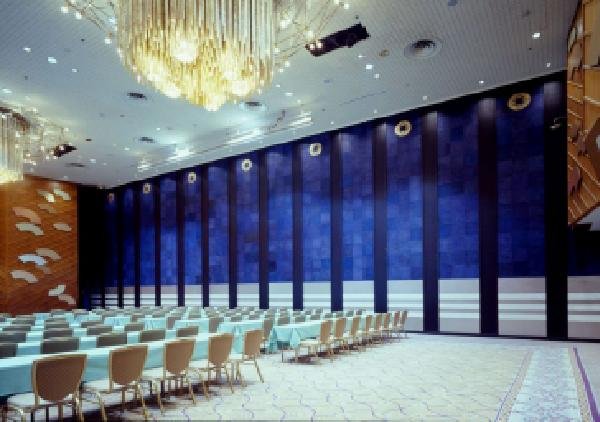宴会場に設置された移動間仕切りRS-160SED。すぐれた遮音性を実現しつつ移動壁を感じさせない装飾デザインです。高い遮音性能を発揮させる為にも設計段階から天井・壁遮音も同時に打合せが必要です。弊社ではランニングウオールの他にも多くのバリエーションがあります。用途・使用場所により最適なタイプをご提案致します。 |